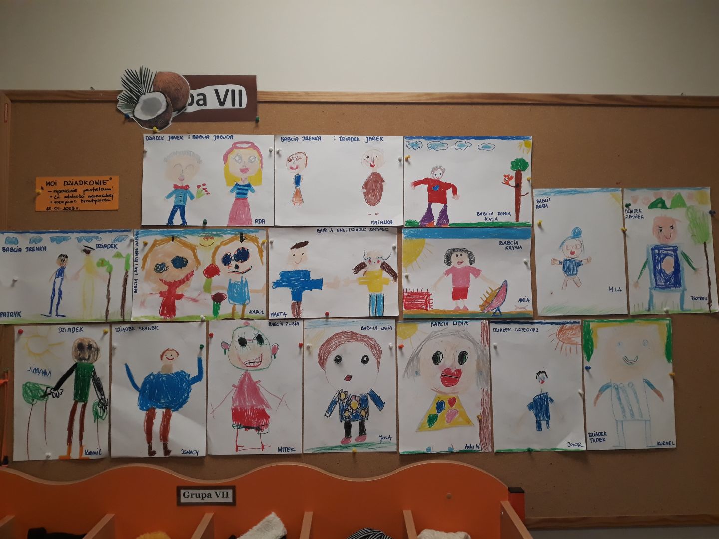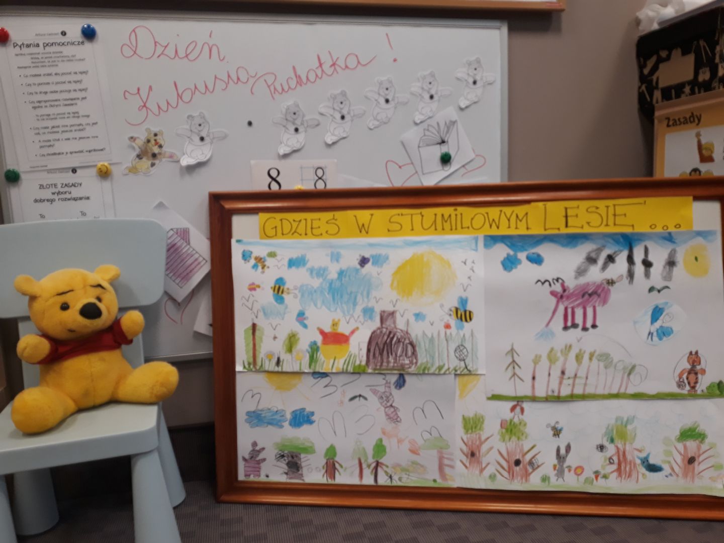 Ostatni tydzień minął wszystkim Kokosom w bardzo ciepłym nastroju ponieważ dzieci: mówiły o swoich kochanych Dziadkach, tworzyły im piękne laurki, wystąpiły z przedstawieniem jasełkowym podczas uroczystości z okazji ich święta oraz wykonały prace plastyczne rysując swoją babcię lub dziadka. Oprócz tego obchodziliśmy w grupie Dzień Kubusia Puchatka podczas którego: gimnastykowaliśmy się z Kubusiem, miś również pomógł nam poznać liczbę 8 oraz na nowo odkryć jego wszystkich przyjaciół. Na koniec dzieci stworzyły wspólny obraz, pt.: " Gdzieś w Stumilowym lesie...".