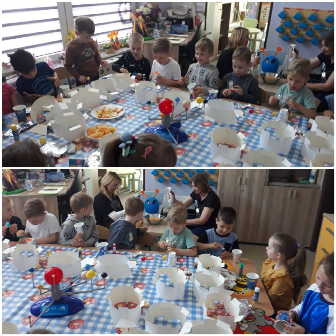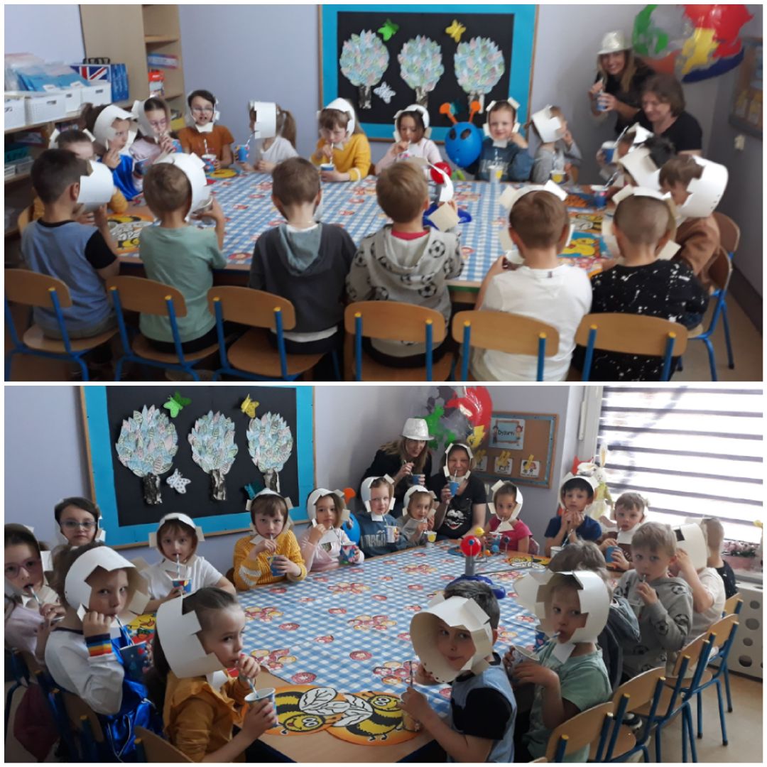 Podsumowując tydzień o kosmosie Kokosy postanowiły jeszcze pokazać dla naszego przybysza, co trzeba jeść aby być zdrowym i silnym. Swoimi sprawnymi rączkami obrały owoce i zrobiły pyszny oraz zdrowy sok pomarańczowy z dodatkiem kiwi. W międzyczasie przyozdobiły kubeczki w galaktyczne gwiazdki, z których wypiły ten "turbowitaminowy" napój i pożegnały się z Kokosowym ufoludkiem, który już wie co trzeba robić aby być zdrowym.