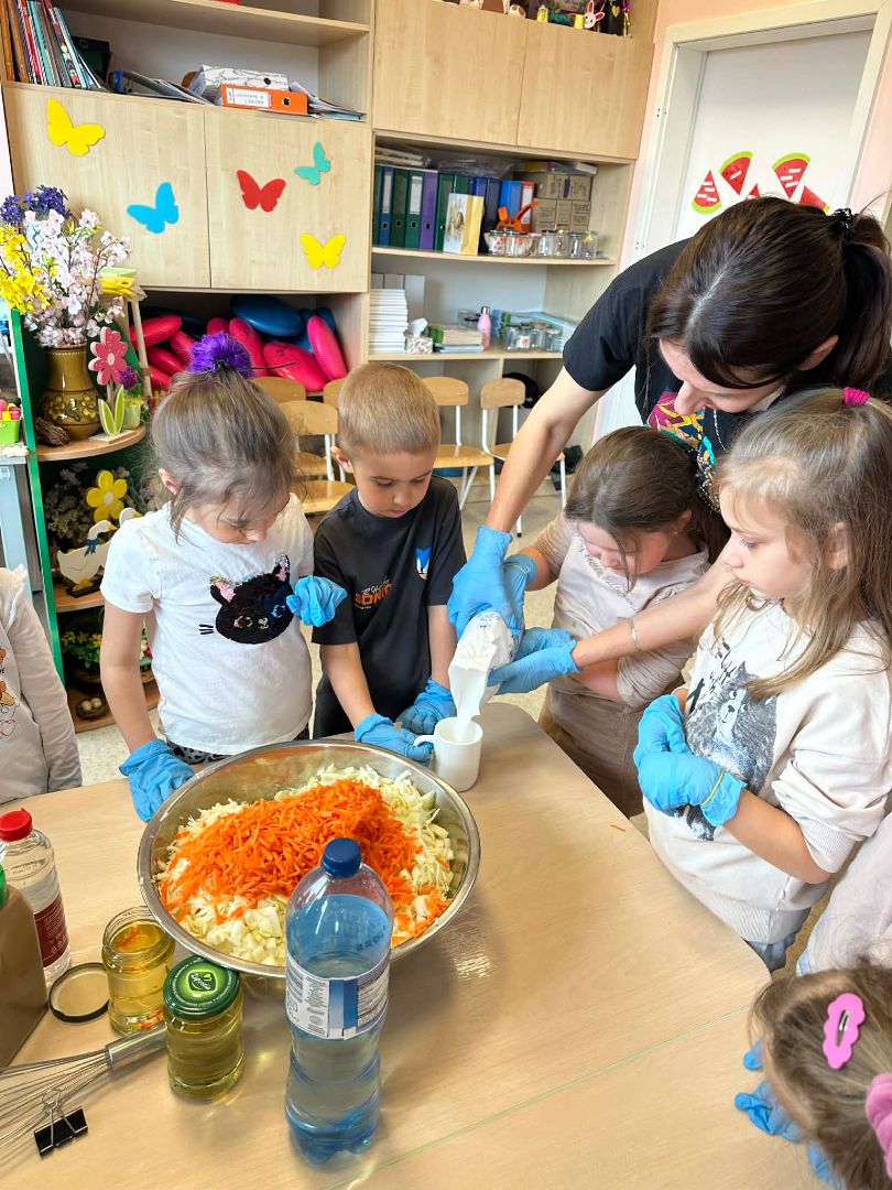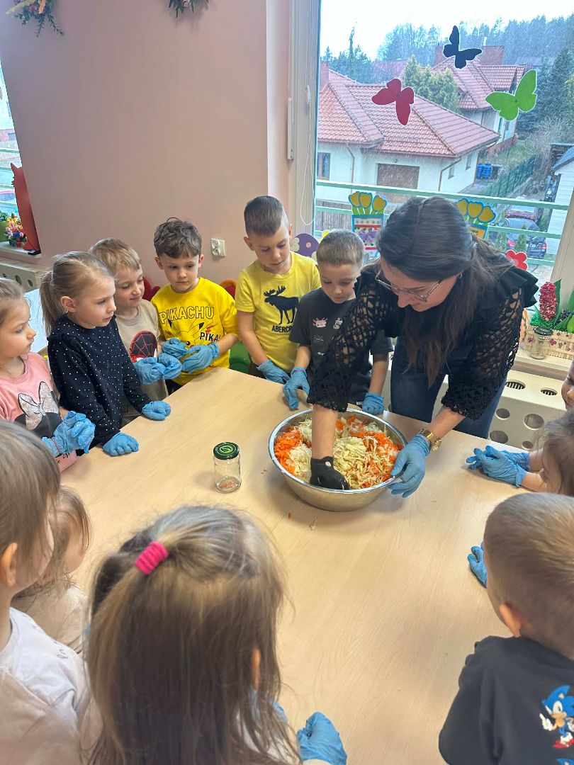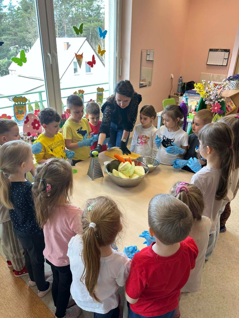 Następnie przystąpiliśmy do działań praktycznych, czyli przygotowania surówki. Dzieci najpierw dokładnie umyły ręce, a potem założyły rękawiczki. Każdy z zaangażowaniem brał udział w pracy – dzieci tarły marchewkę, dodawały pokrojoną przez p. Anię cebulę oraz poszatkowaną kapustę. Wspólnie przygotowaliśmy również zalewę do surówki, którą następnie dodaliśmy do warzyw.