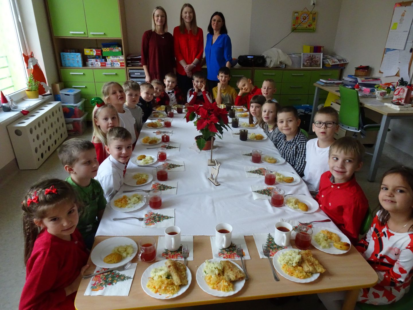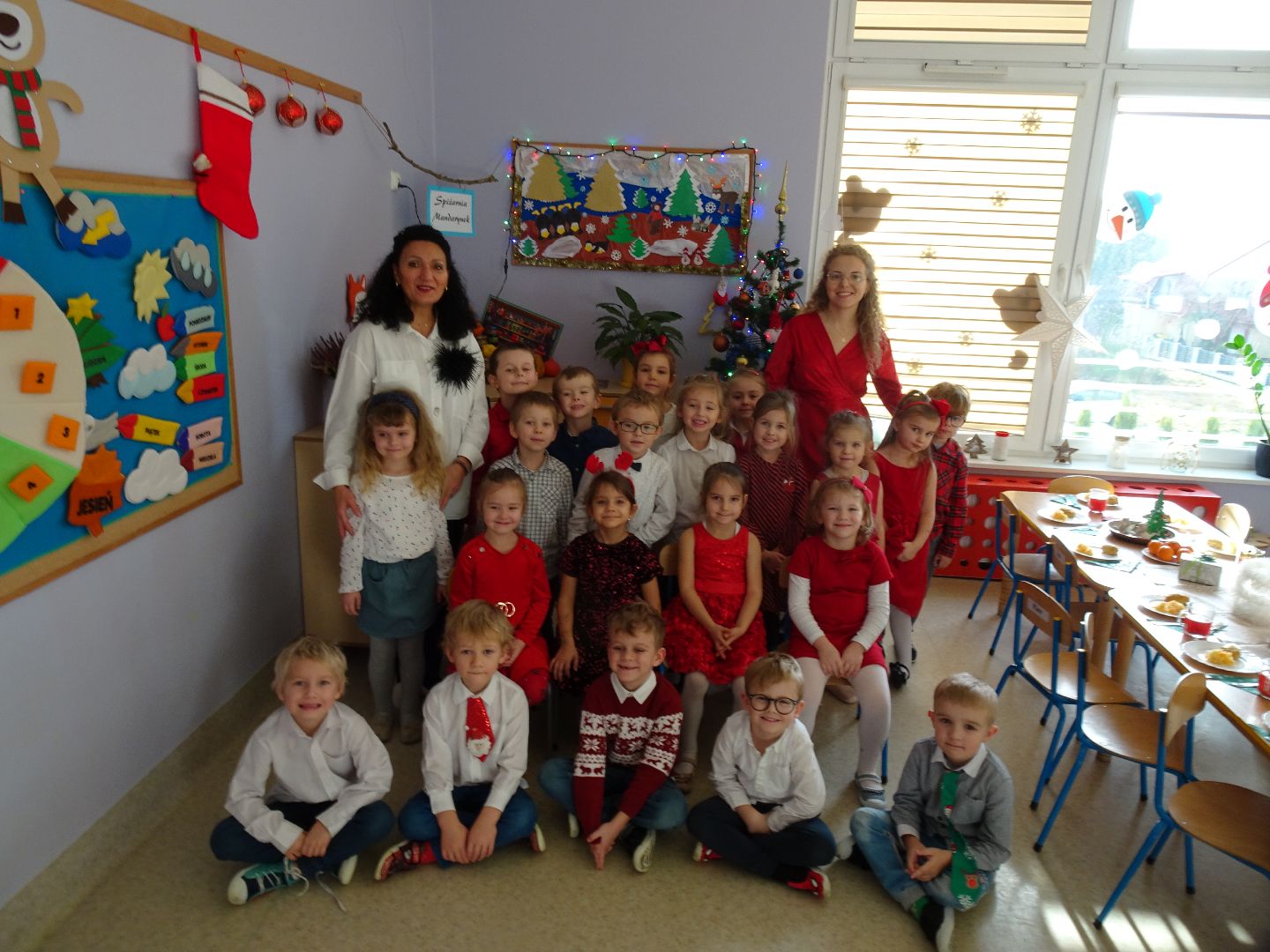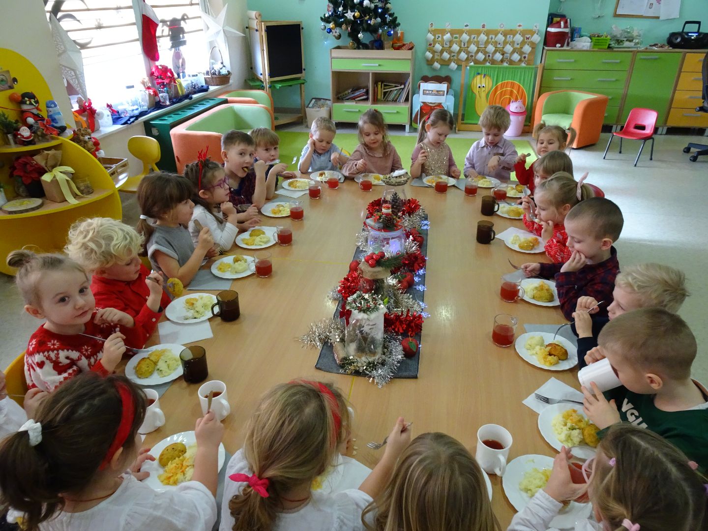 W piątek, 22 grudnia 2023 odbyły się w naszym przedszkolu Wigilie w poszczególnych grupach. Święta Bożego Narodzenia to magiczny czas. Dla wielu z nas jest to dzień niezwykle radosny , spędzony w gronie najbliższych. Czekamy na pierwszą gwiazdkę, dzielimy się opłatkiem, składamy sobie życzenia, śpiewamy kolędy, jemy świąteczne potrawy. Także w naszym przedszkolu nastał wspaniały moment- Wigilia, Boże Narodzenie! Dzieci wspólnie z Paniami kolędowały, składały sobie życzenia i jadły wspólny świąteczny obiad przy pięknie udekorowanym stole. Takie podniosłe chwile nie tylko utrwalają dzieciom znajomość tradycji i zwyczajów świątecznych lecz również, co najważniejsze wzmacniają bliskie serdeczne relacje. Wesołych Świąt!