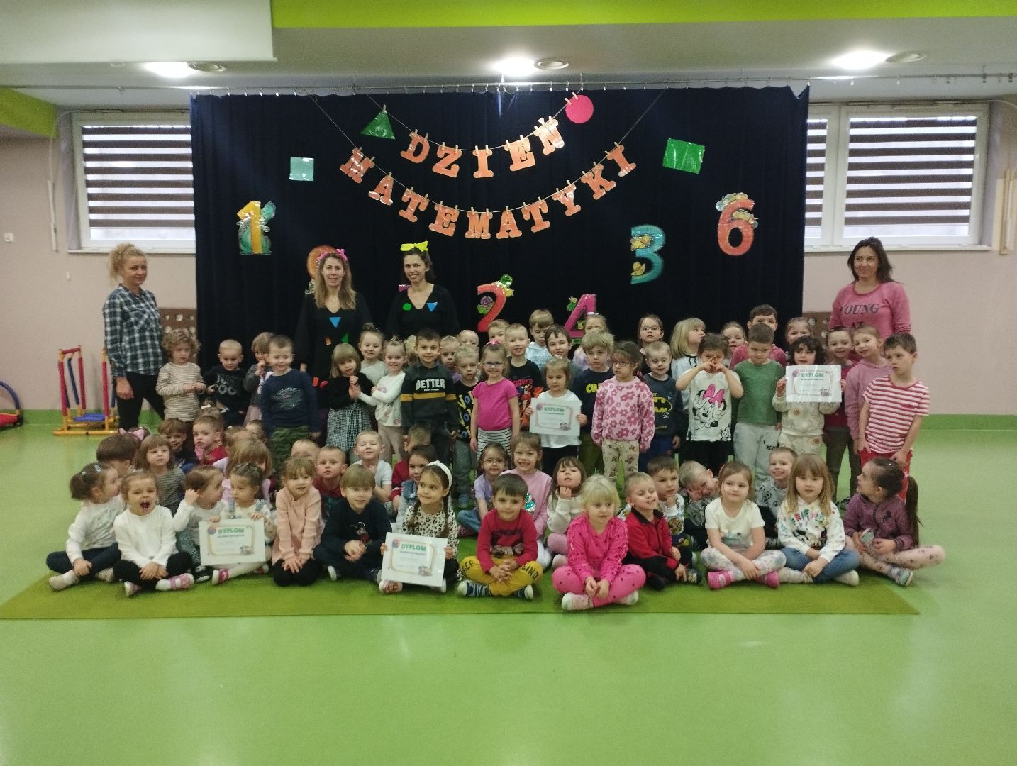 14 marca we czwartek przedszkolaki z naszego przedszkola obchodziły Międzynarodowy Dzień Matematyki. Było wesoło, zabawnie i aktywnie. Wszystkie przedszkolaki uczestniczyły w grach, zabawach matematycznych, konkurencjach gimnastycznych, tańczyły do piosenek matematycznych. Podczas zabaw grupy młodsze ( I, II, III, VIII) uczestniczyły w zabawach z figurami geometrycznymi, wytrwale ćwiczyły prawą i lewą stronę, uważnie wysłuchiwały rytm, segregowały figury geometryczne. Starsze przedszkolaki z grup ( IV,V, VI, VII) uczestniczyły w zabawach zespołowych z wykorzystaniem maty edukacyjnej, wiatraka matematycznego, logigramu i klocków.