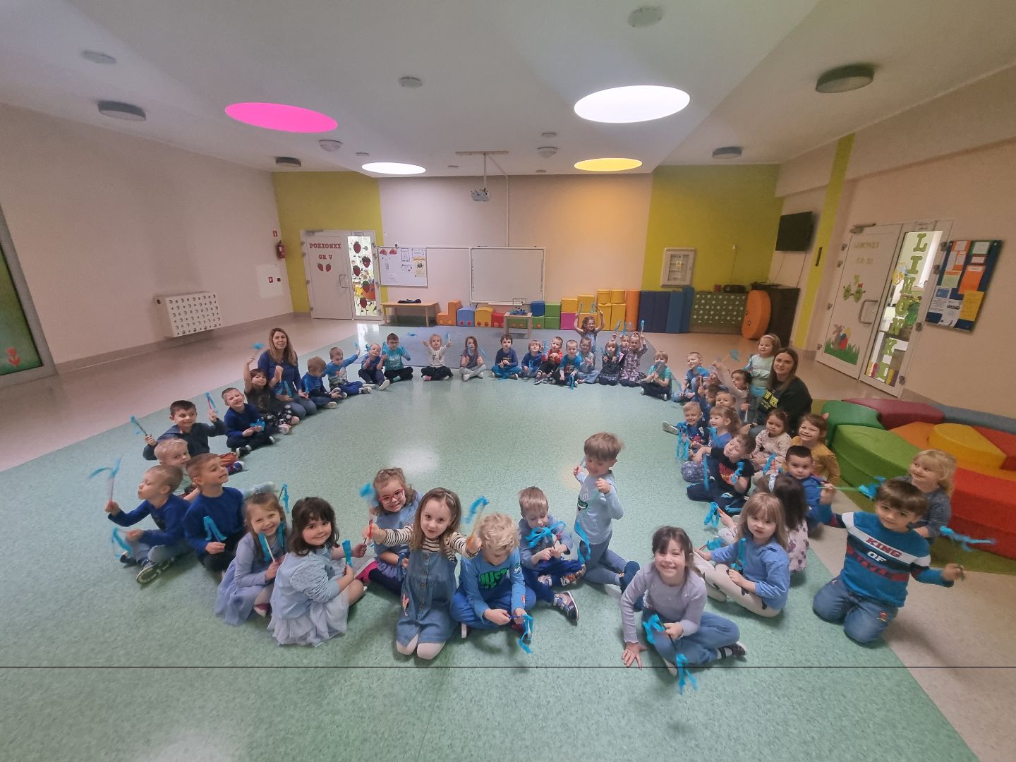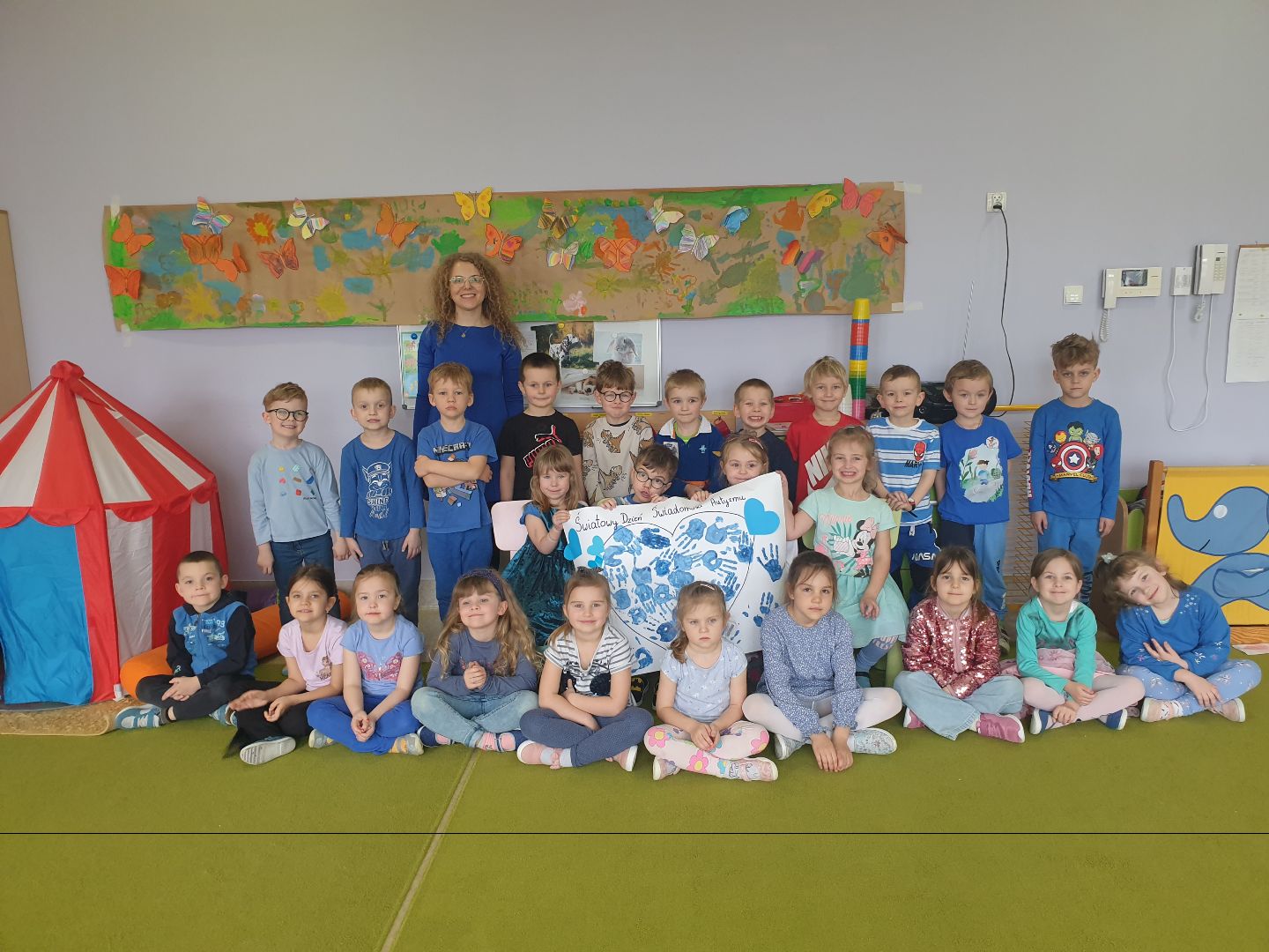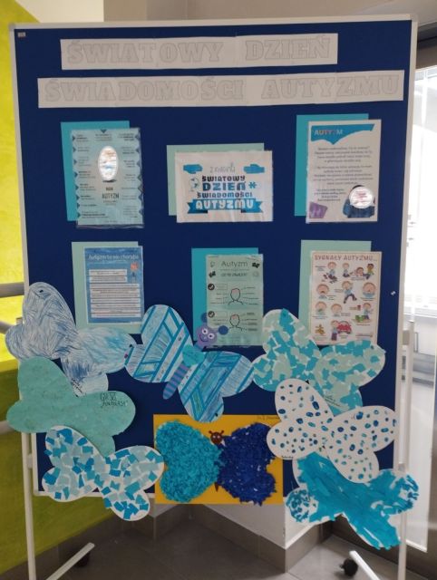 Dziś w przedszkolu wszystkie grupy obchodziły Światowy Dzień Świadomości Autyzmu. Z tej okazji przedszkolaki, nauczycielki i personel ubrali się na niebiesko, gdyż symbolem solidarności z „autystami” jest ten właśnie kolor. Każda z grup wykonała też prace plastyczną ,,niebieski motyl'', które można oglądać na tablicy informacyjnej na temat autyzmu znajdującej się na klatce schodowej na piętrze I, obok galerii prac z konkursu ,,Świat się mieni na niebiesko''.