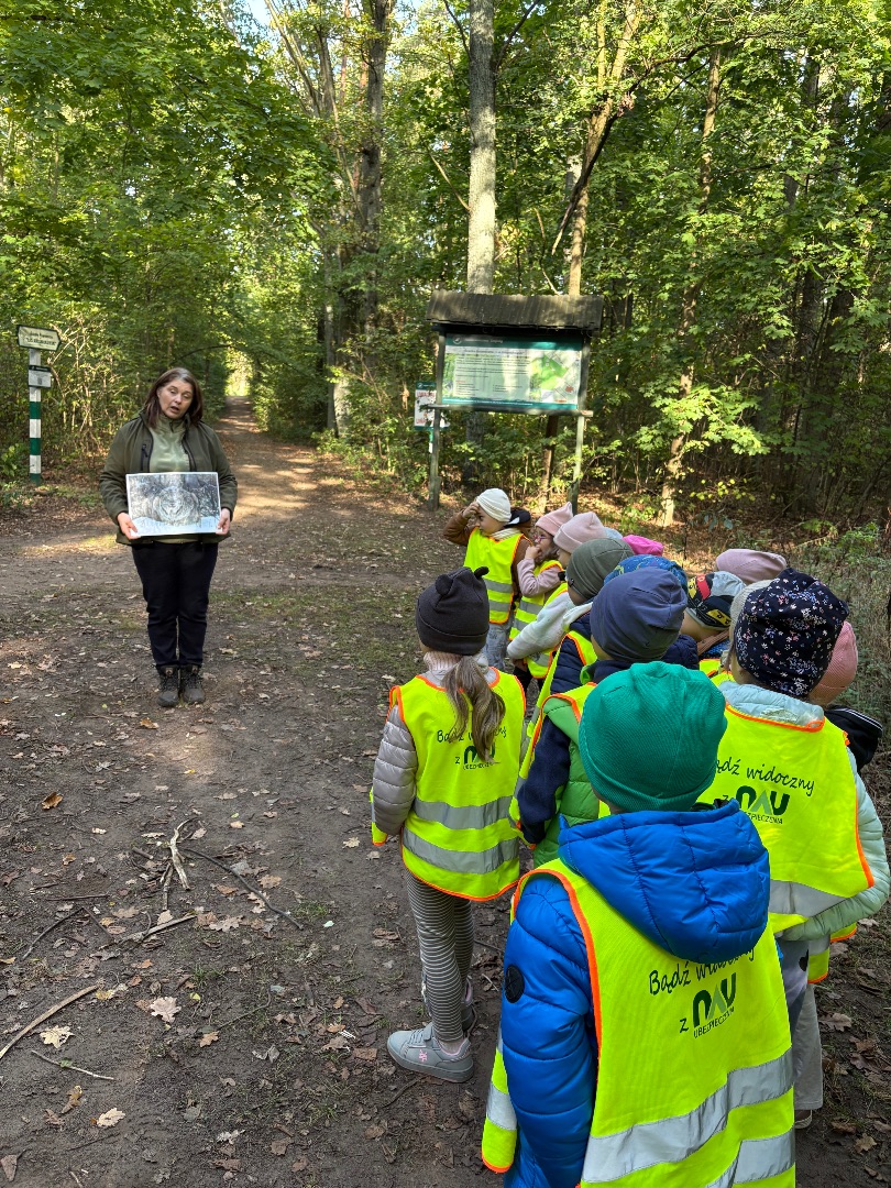 Tam przywitała nas Pani ekspertka od edukacji leśnej – Pani Maria Stypułowska. Tematem naszego spotkania było: „Bezpieczeństwo w lesie” oraz „Przygotowanie zwierząt leśnych do zimy”. Na początku wspólnie omówiliśmy zasady bezpiecznego poruszania się po lesie, co wolno a czego nie wolno robić w lesie. Pani Maria na podstawie ilustracji zapoznała dzieci ze sposobami przygotowań zwierząt leśnych do zimy. Potem wszyscy wyruszyliśmy na spacer po lesie, gdzie szukaliśmy specjalnie oznaczonych drzew w lesie, widzieliśmy norę wykopaną przez zwierzęta, poznaliśmy znaki dotyczące drogi przeciwpożarowej w lesie. Na koniec Pani Maria dała dzieciom lupy, przez które jeszcze lepiej mogliśmy obserwować przyrodę w lesie: liście, grzyby i roślinność.