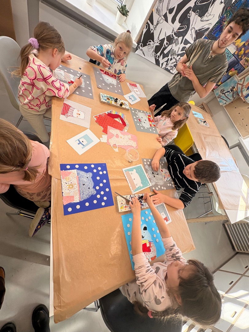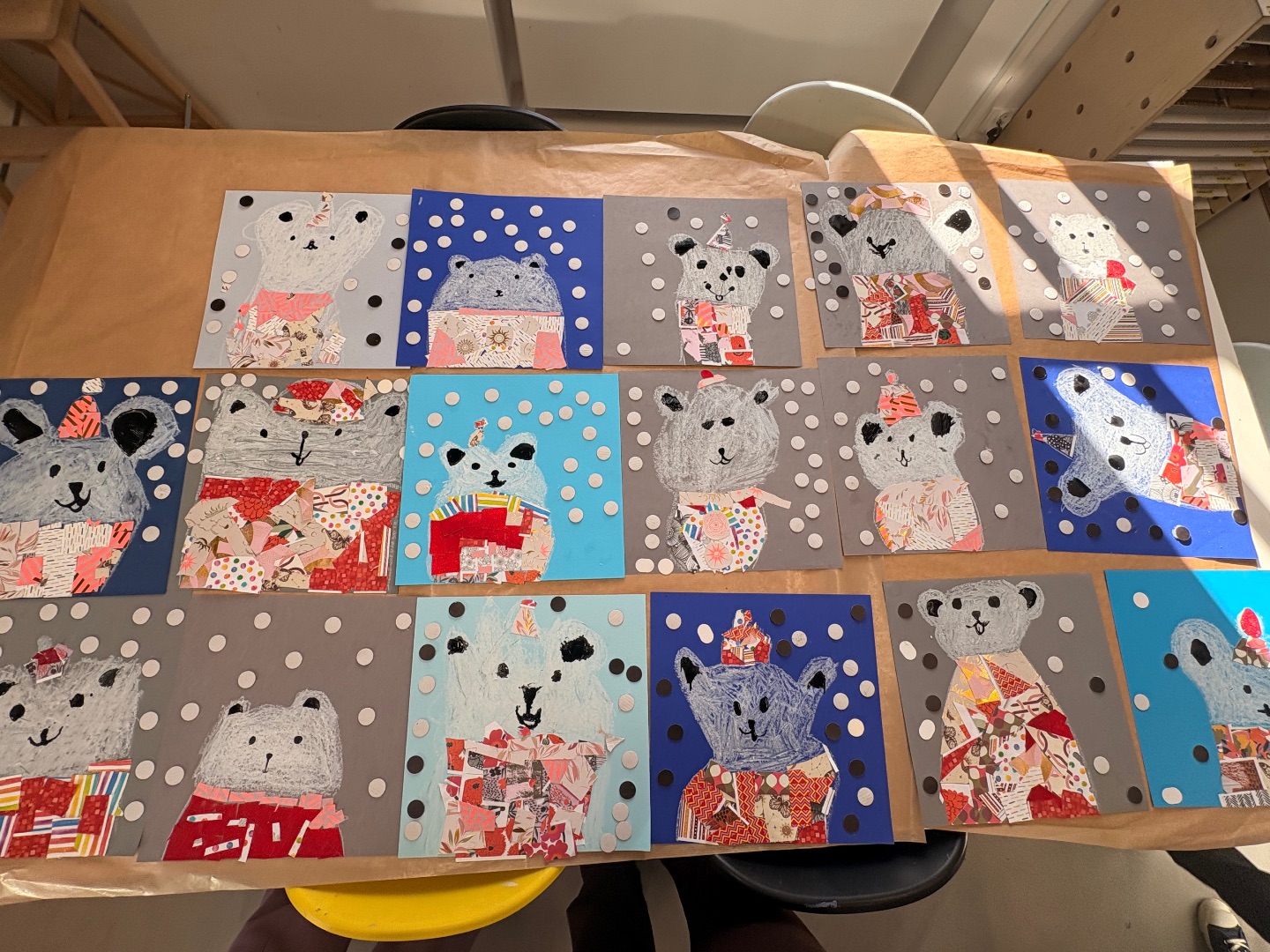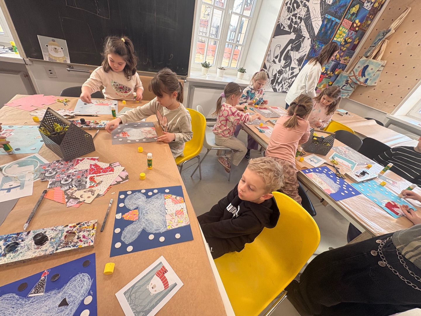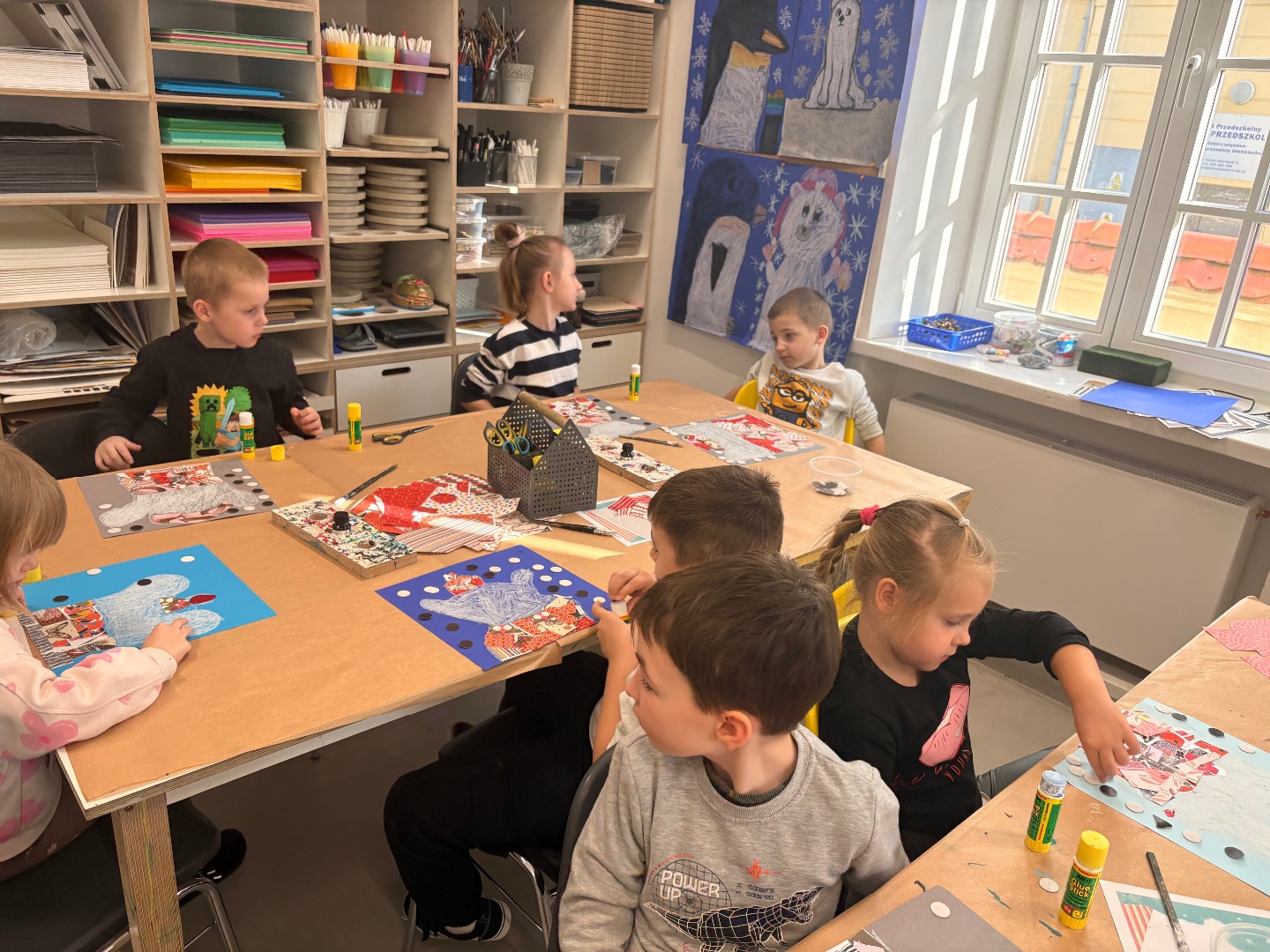 Najważniejszym punktem wizyty były warsztaty plastyczne, podczas których dzieci miały okazję wcielić się w rolę prawdziwych artystów. Tematem zajęć był niedźwiedź polarny. Dzieci wykonywały kolaże, wykorzystując różnorodne materiały – kolorowy papier, gazety oraz elementy dekoracyjne. Z wielkim zaangażowaniem wycinały, przyklejały i komponowały swoje prace, tworząc wyjątkowe, pomysłowe wizerunki niedźwiedzi polarnych w pięknych kolorowych sweterkach.